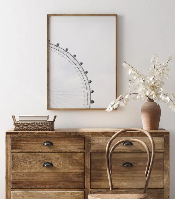 Et imponerende sort-hvidt print af London Eye. Med den grå Londonhimmel i baggrunden leder hjulets eger øjet hen til de ni passagerkabiner. Et virkelig imponerende print, der fremhæver denne storslåede tekniske konstruktion. Forestil dig udsigten fra en af disse kabiner.