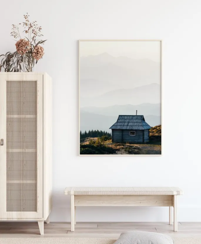 En enkel, lille blå hytte på en bakketop. De fjerne bakker i den tågede baggrund skaber et magisk billede. Til venstre for hytten giver de mørke, grønne fyrretræer ekstra farve til dette enkle, men smukke print. Hænges op på en lys væg for at give en følelse af åbent rum.