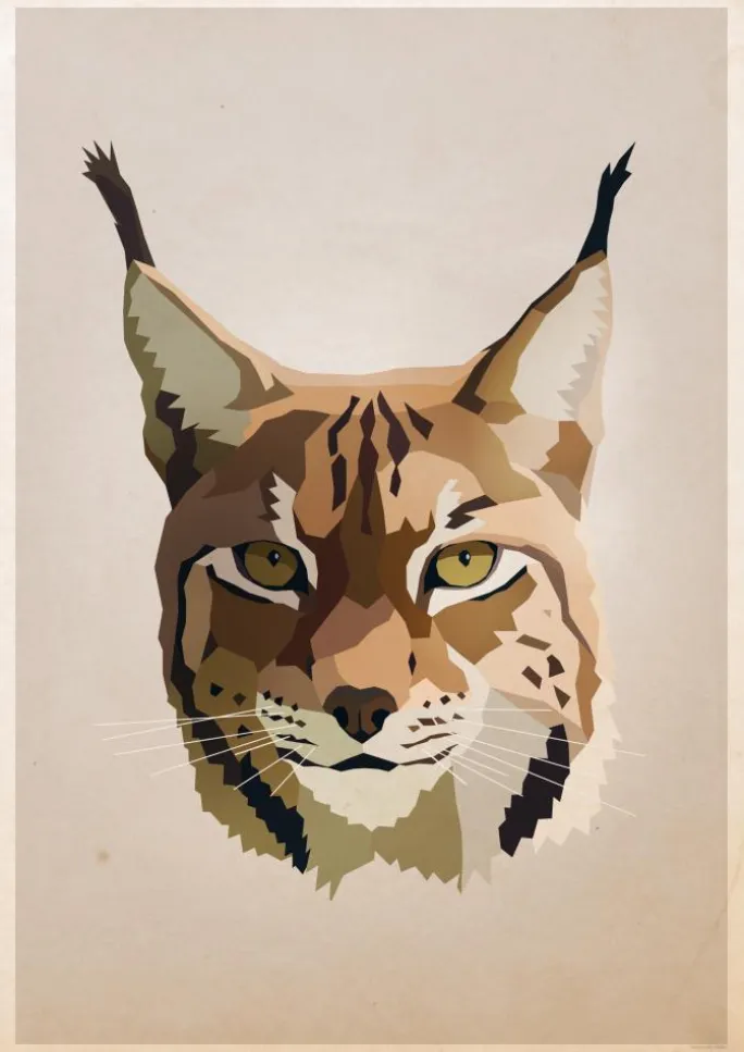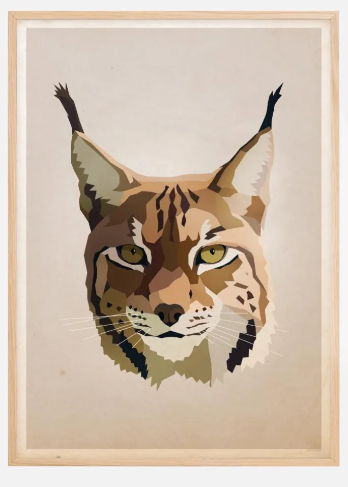 Et intenst pastelfarvet print af en smuk lynx. På en lyserød baggrund repræsenterer lynxens øjne et opmærksomt og alligevel dominerende blik. De forskellige brune og grønne pastelfarver passer smukt ind i lynxens øjne.