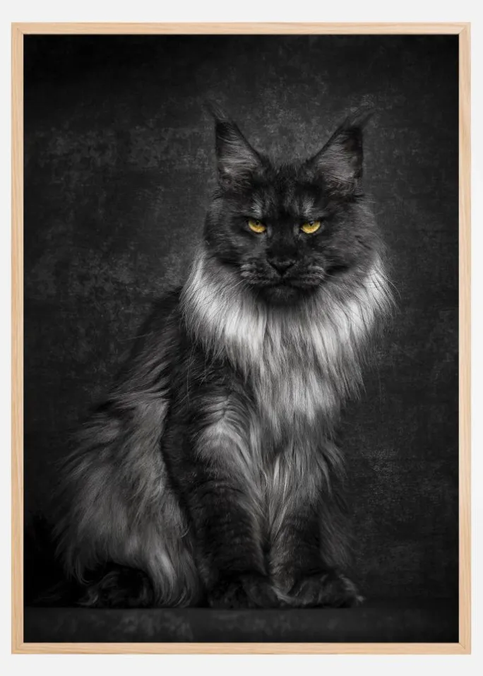 En fængslende plakat af en sort/hvid kat på en lignende farvet baggrund. Med et stolt og alligevel aggressivt blik skaber kattens små gule øjne en følelse af dominans. Kattens hvide halsudskæring, der stirrer lige ind i kameraet, smelter blødt ind i printet. Et ideelt print til dyreelskere.
