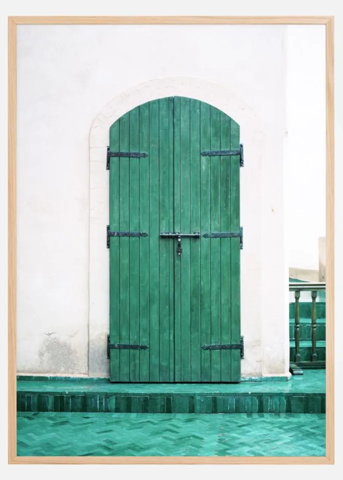 Denne elegante plakat afbilder en klassisk grøn dør mod en hvid væg, som ligger lige ved vandet, hvilket skaber et fredfyldt og harmonisk billede. Den grønne dør, komplet med traditionelle beslag, lyser op mod den rolige baggrund og spejles smukt i vandets overflade, hvilket tilføjer dybde og dimension til billedet. Designet af døren er enkelt men slående, og de bløde linjer og kurver i arkitekturen omkring tilføjer til den æstetiske skønhed.