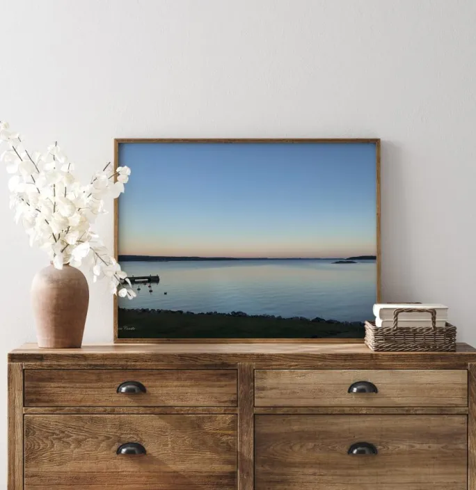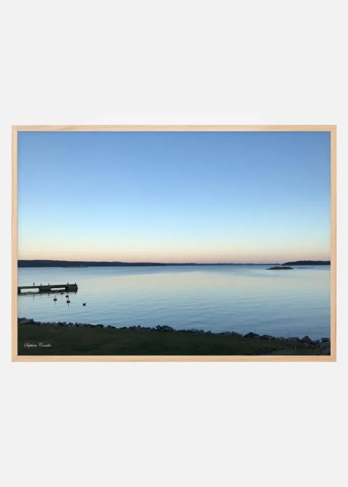 En fotografisk plakat af den svenske skærgård med sine øer og skær i smuk solnedgang. En brygge med sine tilstødende flydebojer giver lidt ekstra liv til billedet. En dejligt beroligende plakat skabt af fotograf Saphira Consilio.