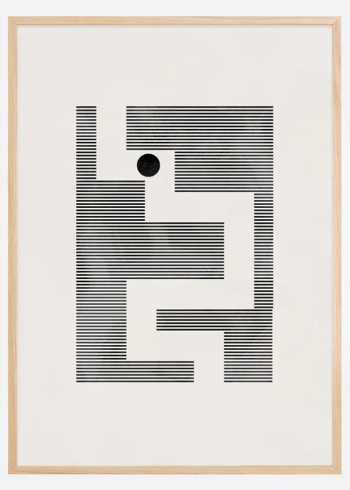 Denne kunstneriske plakat byder på en minimalistisk fortolkning af en labyrint, udført med sorte linjer, der danner et indviklet væv af geometriske former mod en cremefarvet baggrund. Den ensomme sorte cirkel placeret i labyrintens midte fungerer som et visuelt ankerpunkt, samtidig med at den giver dybde og fokus til det ellers enkle motiv. Denne design leger med iagttagerens øje og opmuntrer til en visuel udforskning af dens veje og blinde ender.