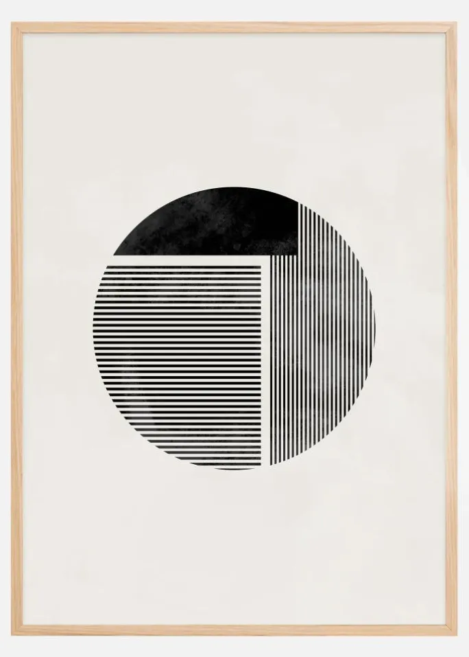 Denne elegante og minimalistiske plakat er en studie i kontrast og enkelhed, der viser en halvcirkel delt i sort og hvid med stribede mønstre. Det abstrakte motiv er en omhyggeligt afbalanceret komposition af geometriske former og linjer, hvilket skaber en øjeblikkelig visuel effekt. Dette kunstværk er en hyldest til det subtile og sofistikerede og tilbyder en tidløs æstetik, der passer i alle moderne hjem eller kontorer.