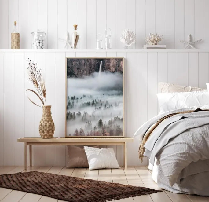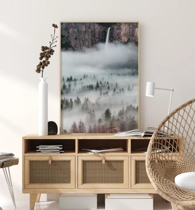Et vidunderligt fotografi af en tåget bjergside med nogle klipper og et spektakulært vandfald i baggrunden. Den overskyede tåge svæver fredeligt og bringer en følelse af en kølig morgen til at forskønne dit hjem. De vidunderlige efterårsfarver og den svævende tåge giver en følelse af mystik.