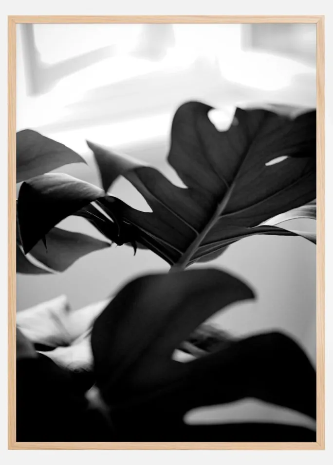 Denne sort-hvide plakat skildrer de smukke og distinkte former af et monsterablad, hvis silhuet og skyggespil skaber en dramatisk og kunstnerisk komposition. Billedets leg med lys og mørke fremhæver bladets naturlige mønster og giver en organisk følelse til motivet. Dette print er en elegant og samtidig fortolkning af naturens skønhed og kunne fungere som en sofistikeret detalje i et minimalistisk hjem.