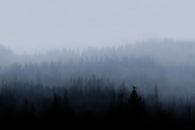 En plakat af en kølig morgen på en tåget skovklædt bjergside. En morgenfugl står på toppen af et træ i forgrunden, mens det klare lys er i horisonten på den bakkede baggrund. Det sort-hvide billede bringer en vinterfornemmelse ind i dit hjem.