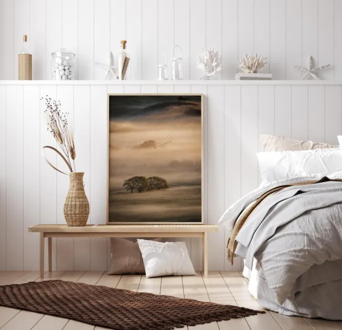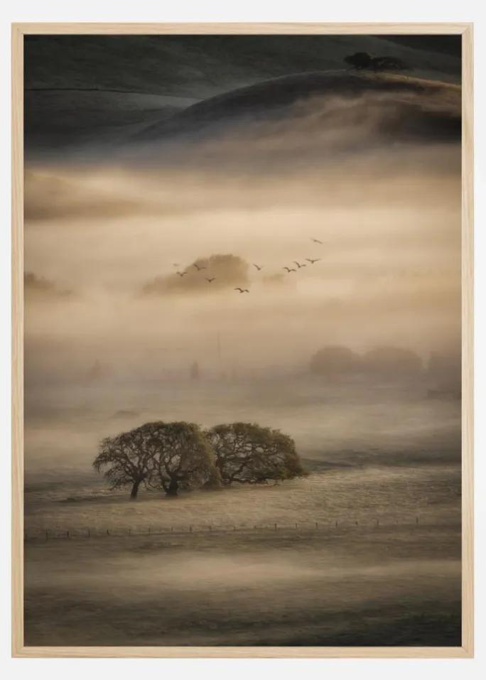 Et hypnotiserende foto af en tåget morgen på en bjergside med fugle, der smukt brager den gule sky. De bløde brune toner i printet skaber en afslappende atmosfære, hvor du næsten kan fornemme naturens friskhed. Bring naturens skønhed ind i dit hjem med dette vidunderlige morgenlandskab.
