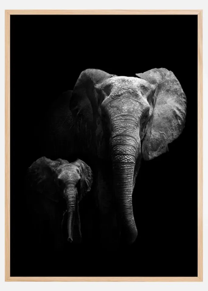 Et fantastisk mørkt foto af to elefanter. De to tilsyneladende mor og kalv står på en mørk baggrund med det skarpe lys, der skinner på deres flagrende ører, hoveder og snabel. Dette smukke print giver en perfekt kølig følelse til dit hjem.