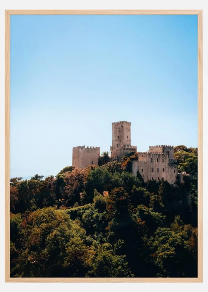 Denne storslåede plakat præsenterer en majestætisk borg, beliggende på en frodig grøn bakke, der skærer gennem den klare blå himmel. Motivet fanger den historiske arkitekturs styrke og elegance, med sine robuste tårne og mure i varierende nuancer af sandfarvet og gråt. Omgivet af frodige træer i rige grønne toner, tilbyder dette print en følelse af både historie og harmoni med naturen, perfekt for alle, der ønsker at tilføje en følelse af eventyr og storhed i deres hjem.