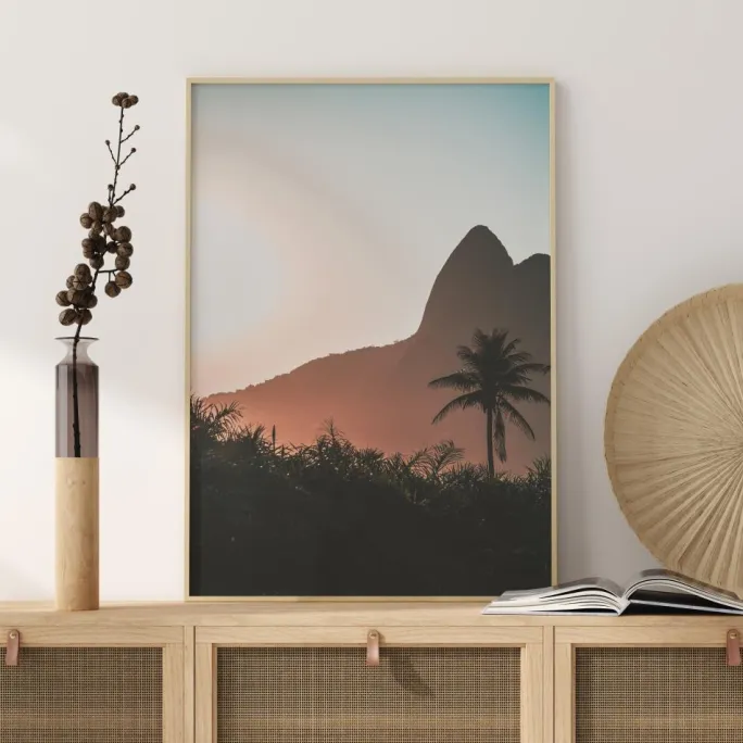 Et fantastisk fotografi af en bjergkæde under solnedgang. Den smukke lyseblå himmel fremhæver en solitær palme omgivet af mindre træer i forgrunden. Solen danner orange stråler, der er klar til at varme dit hjem. Et perfekt print til at hænge på en bar væg