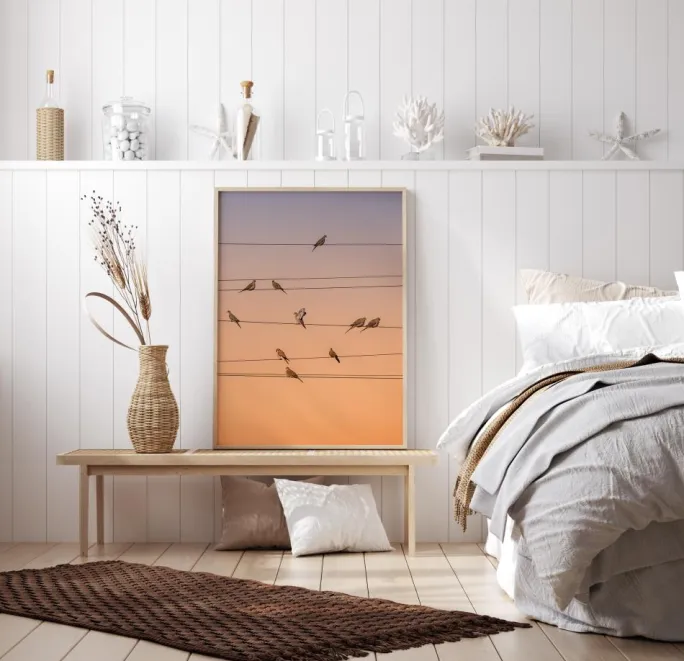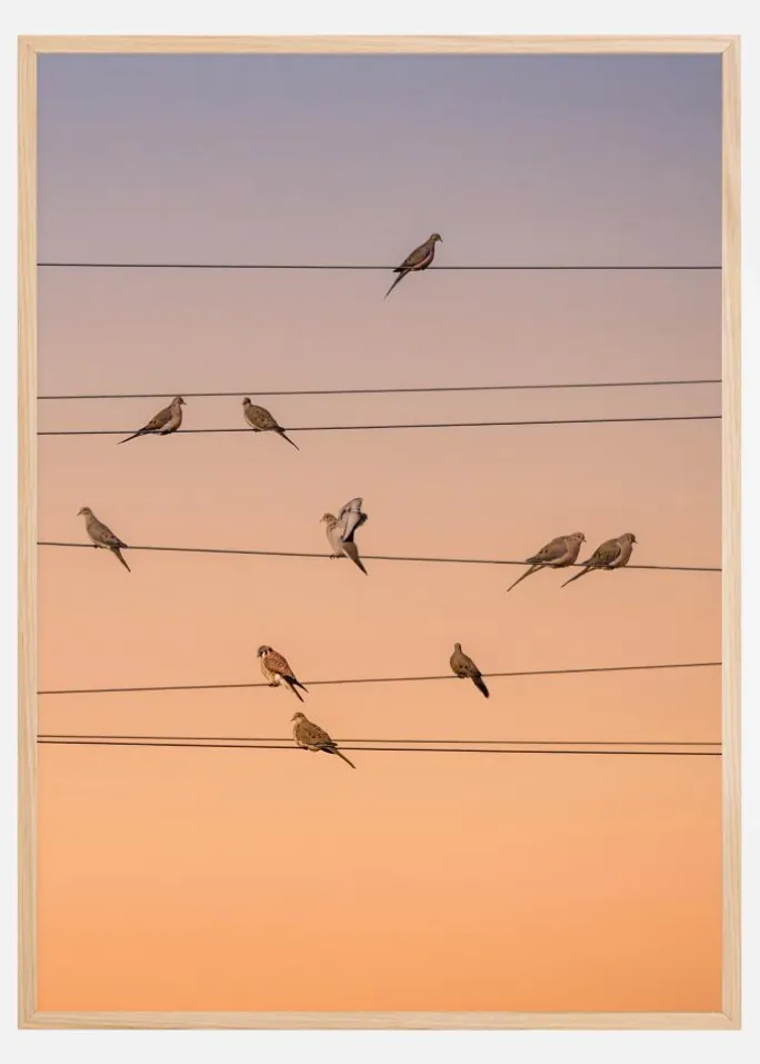 Et fantastisk print af fugle, der sidder på elkabler. Belyst af den orange aftenkugle danner kablerne mønstre som på et nodeblad. Det imaginære nodeblad giver en perfekt fornemmelse af fuglenes sang. Klar til enhver væg i stuen.