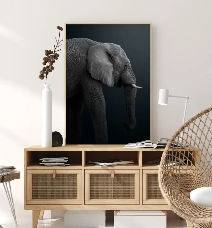 Et bedårende portræt af en sund namibisk elefant. Med den grå kæmpe vendt mod højre, hvor dens snabel hænger. Den mørkeblå baggrund skaber en følelse af tristhed, da elefanten virker meget ensom. Et smukt print til alle elskere.