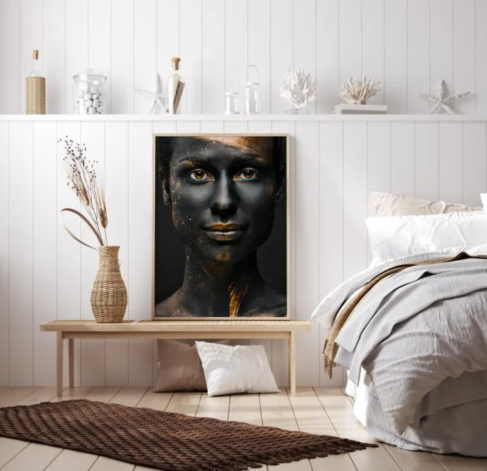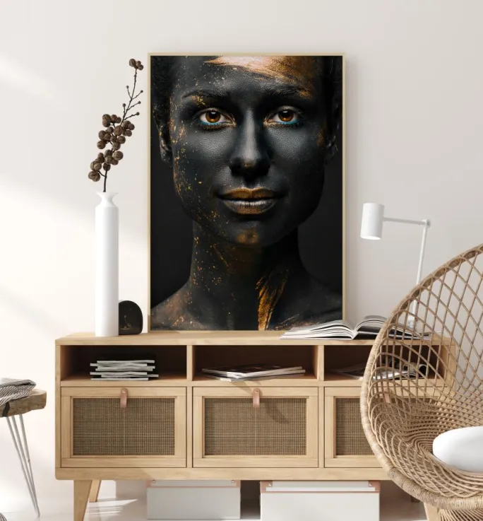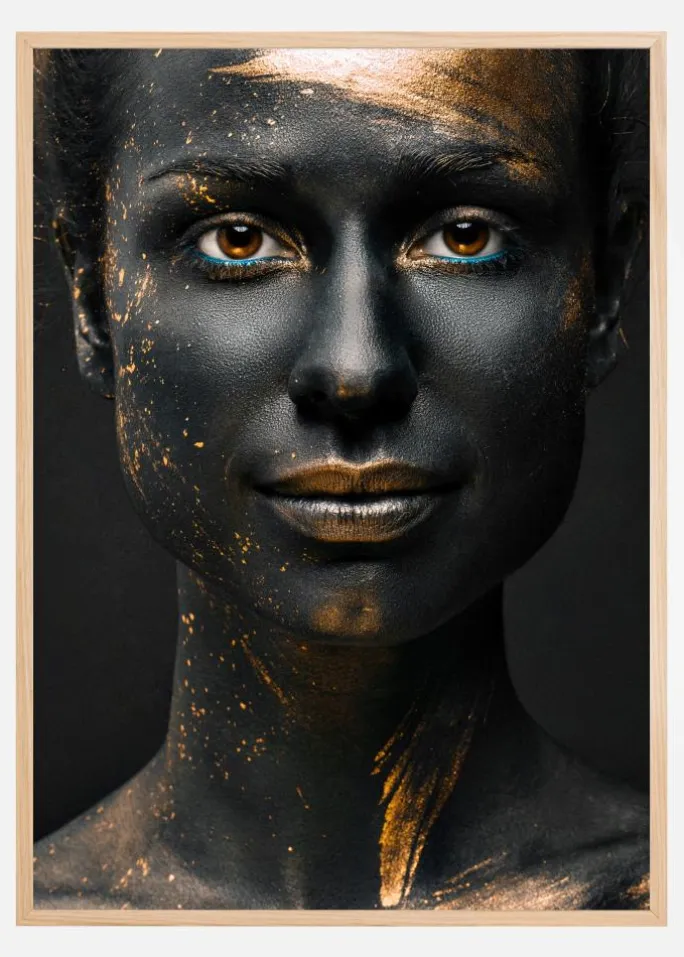 Et sort på sort portræt af en smilende dame med gråmalet ansigt. Kvindens ansigt er blevet oversprøjtet med guldmaling på panden, læberne og halsen. Kvindens øjne, der stirrer lige ind i kameraet, er blevet fremhævet med blå eyeliner, hvilket skaber et intenst blik. Dette smukke print viser et billede af perfekt skønhed, der vil lyse op i dit hjem.