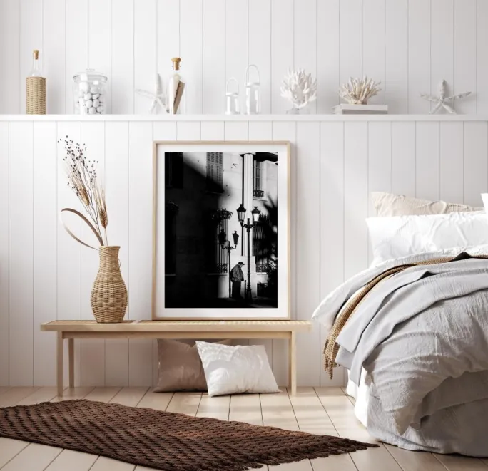 Et fotografi i sort-hvid af en ældre mand, der med et søgende blik står og betragter noget omgivet af byens livlige skyggespil. En rolig og fin plakat, som gør sig lige så godt alene som sammen med andre favoritter på en større billedvæg.