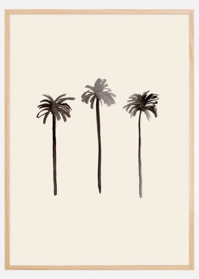 Et simpelt sort-hvidt håndtryk af tre palmer i en række. På en beige baggrund er der brugt forskellige nuancer af sort for at skabe mørket på bladene. Et enkelt print til at hænge på væggen i din stue.