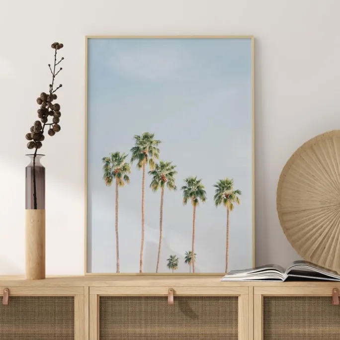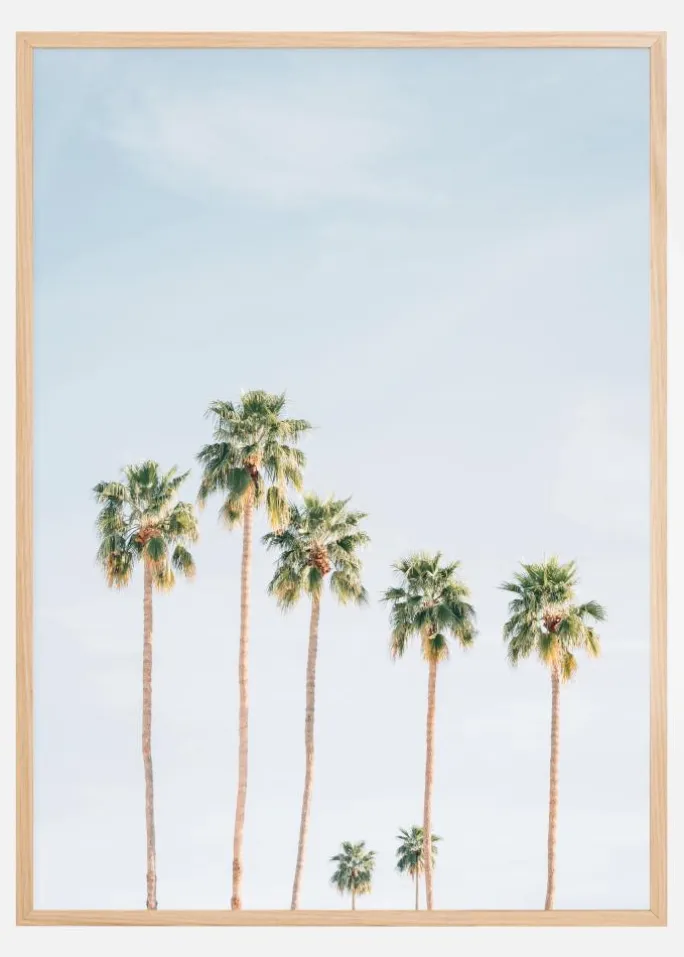 Et dejligt print af fem palmer i en række. Den lyseblå himmel passer perfekt sammen med palmernes bløde grønne og brune toner i palmerne. To yderligere palmer kan ses i det fjerne. Et smukt print til at hænge på en lyseblå væg.