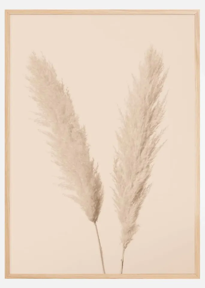 Nærbilleder af to hoveder af pampasgræs. De dæmpede pastelfarver og rosa farver på dette billede fremhæver virkelig græssets lethed, og du kan føle roen bølge, når du betragter det.