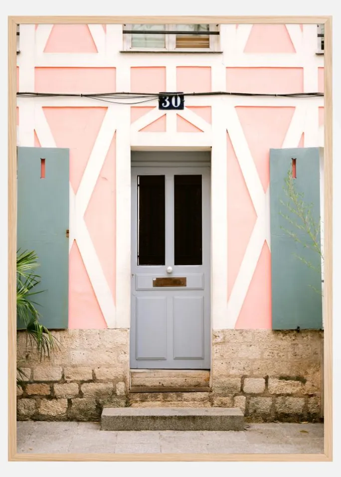 Opdag en urban oase af fredfyldt æstetik med vores seneste plakat, der fanger essensen af minimalistisk arkitektur og legesyge. Denne print pryder din væg med sin distinkte symmetri og geometriske mønstre. Den pastelrosa baggrund ledsages af kontrasterende koralfarvede trekanter og rammer, hvilket skaber et billede, der er både drømmende og struktureret. De mørke, næsten sorte skodder og den lysegrå dør forstærker yderligere det nutidige udtryk, mens den lysegrå dør udgør en rolig midtpunkt i kompositionen.