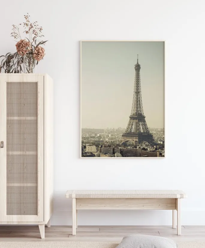 Et spektakulært billede af Eiffeltårnet. Den overskyede himmel fremhæver skønheden ved denne spektakulære arkitektoniske struktur. De omkringliggende bygninger passer perfekt til dette prints sort/hvide design. Forestil dig udsigten fra toppen af denne bygning, når du hænger dette print op i dit hjem.