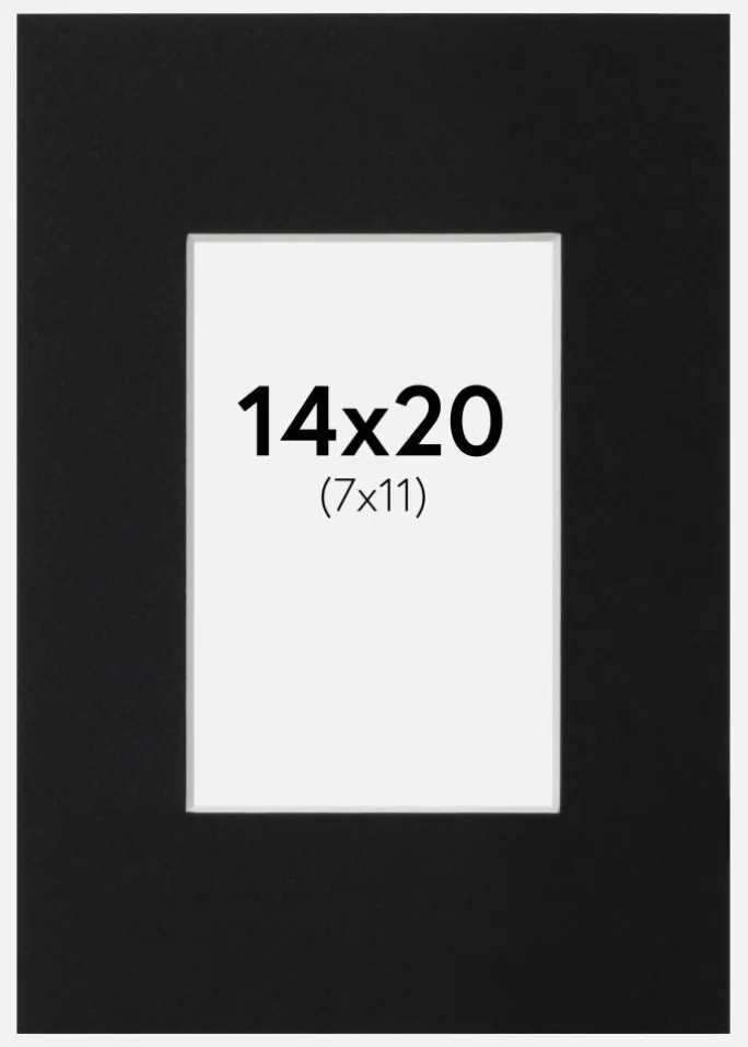 Passepartouten har en skråtskåret inderkant med en hvid kerne, som skaber en subtil kontrasteffekt, der giver en dyb og elegant indramning. Den matte sorte overflade giver et professionelt og stilrent udseende, hvilket gør den ideel til at fremhæve motiver på en smagfuld måde.