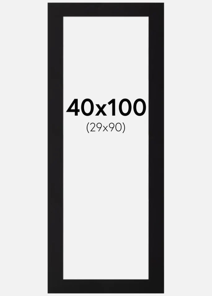 Denne elegante passepartout i sort er det perfekte valg for at give dine billeder en stilfuld indramning. Med en skråskåret inderkant og en hvid kerne skabes en subtil kontrasteffekt, der giver dybde og elegance til dit motiv. Passepartouten er designet til at passe billeder i størrelsen 30×91 cm, mens ydermålet er 40×100 cm, hvilket gør den ideel til at fremhæve både portrætter, kunstværker og fotografier.
