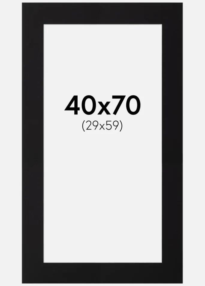 Denne elegante passepartout i sort er det perfekte valg for at give dine billeder en stilfuld indramning. Med en skråtskåret inderkant og en hvid kerne skabes en subtil kontrasteffekt, der giver dybde og elegance til dit motiv. Passepartouten er designet til at passe billeder i størrelsen 30×60 cm, mens ydre dimensionen er 40×70 cm, hvilket giver en smuk indramning med en jævn og harmonisk kant rundt om dit kunstværk.