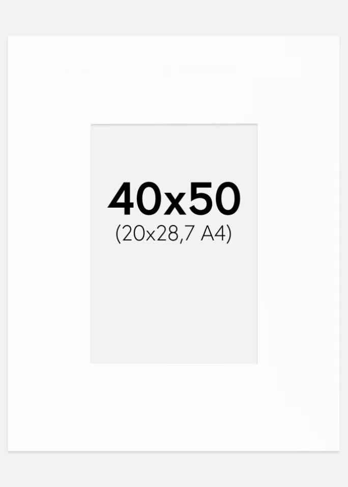 Denne elegante passepartout i hvid nuance er det perfekte valg for at give dine billeder og kunstværker en stilfuld indramning. Med en skråtskåret inderkant i samme hvide farve skabes en dybde, der fremhæver motivet på en sofistikeret måde. Passepartouten er designet til at passe billeder i størrelsen 21.00×29.70 cm (A4), mens ydermålet er generøse 40×50 cm, hvilket giver ekstra brede kanter og skaber en følelse af rum.
