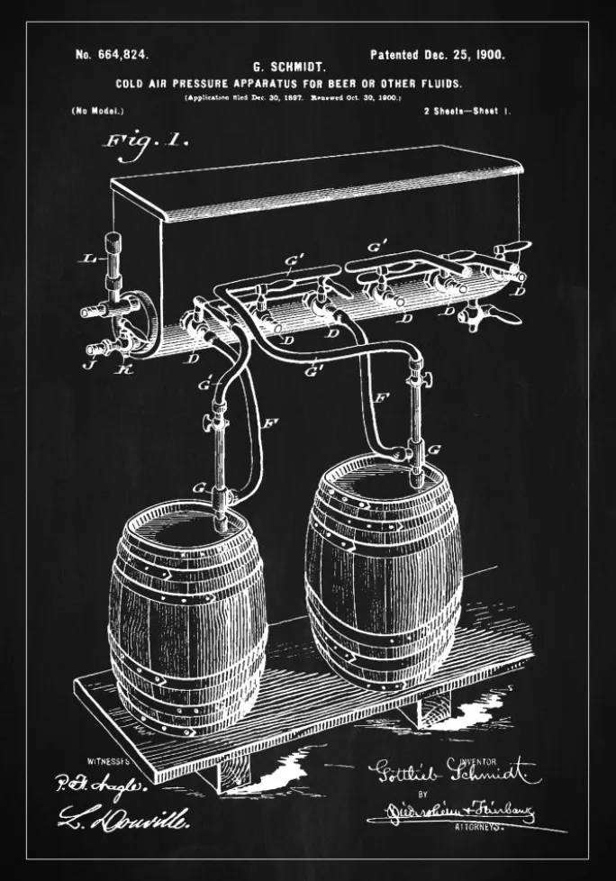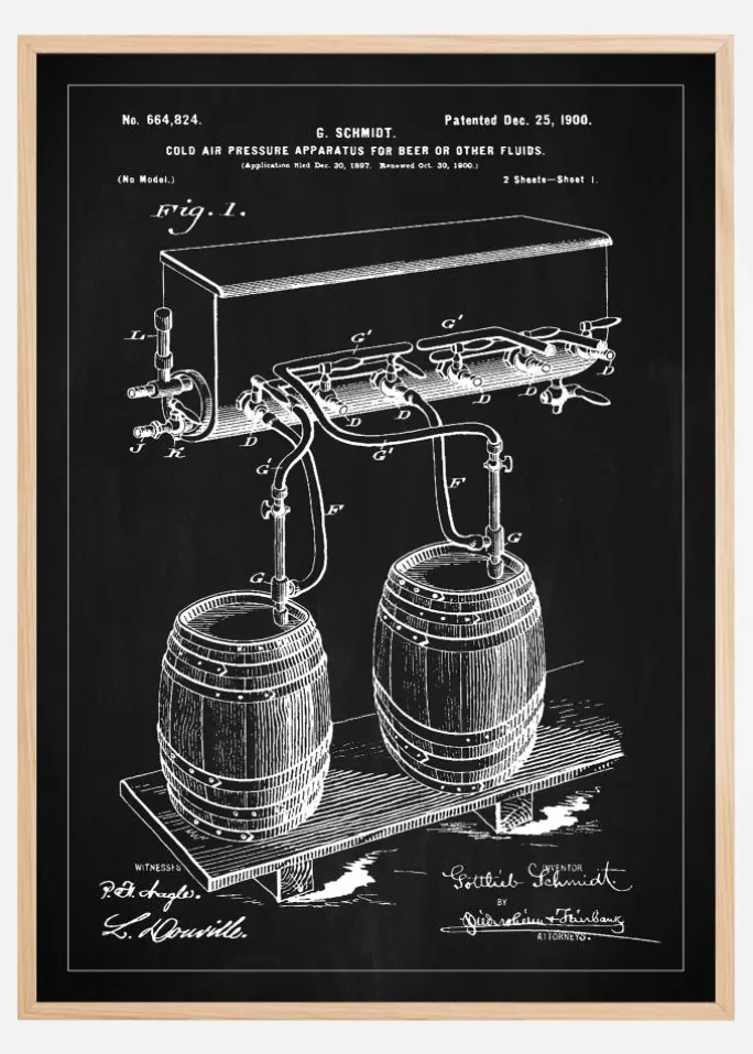 Denne distinkte patentplakat præsenterer en historisk kold luft trykanordning til øl eller andre væsker, patenteret den 25. december 1900 af G. Schmidt under patentnummer 664,824. Illustrationen fremhæver den nøje mekanik og innovation bag tidlige kølesystemer, med tapphaner og tønder, der viser, hvordan teknologien blev brugt ved århundredeskiftet. Detaljerigdommen i konstruktionen fanges smukt mod den kontrastfyldte sort-hvide baggrund.