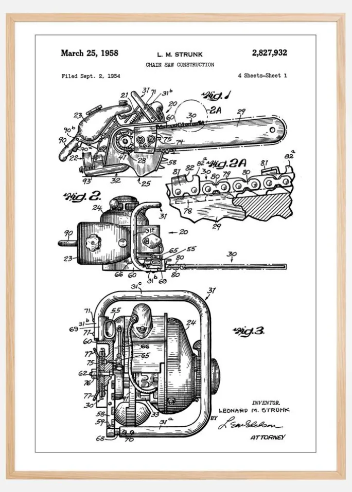 Denne fascinerende patentplakat, nøje udvalgt til vores kollektion, viser designet af en motorsav, en opfindelse af Leonard M. Strunk patenteret den 25. marts 1958 under patentnummer 2,827,932. Detaljerigdommen i patenttegningen er imponerende og fremhæver den mekaniske innovation og den funktionelle æstetik hos denne vigtige værktøjskonstruktion.
