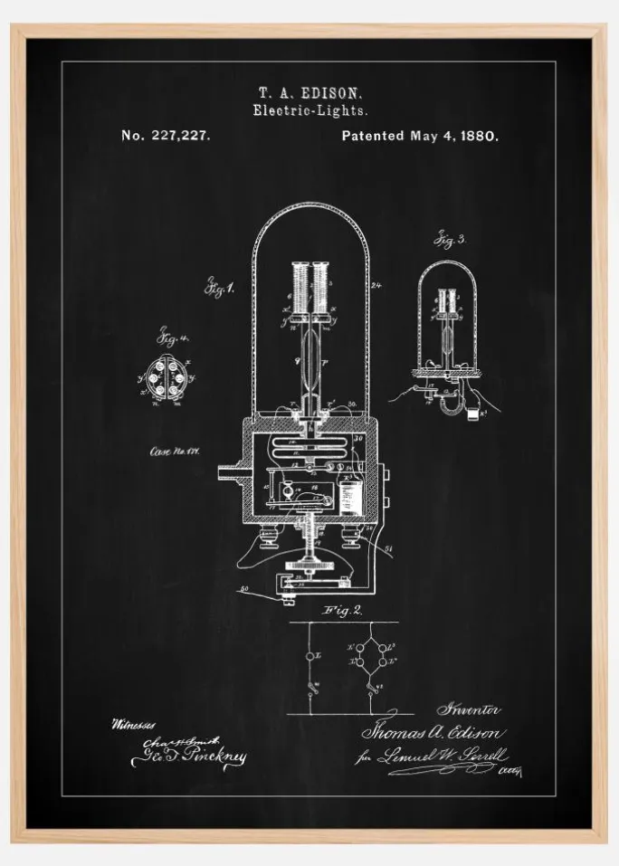 Denne unikke patentplakat præsenterer en af de mest revolutionerende opfindelser i historien – T.A. Edisons elektriske lys, som officielt blev patenteret den 4. maj 1880 under patentnummer 227,227. Motivet fremstilles i et stilrent sort og hvidt design og fanger betragteren med dens kompleksitet og historiske værdi. Det er en fantastisk samtalestarter og et stilfuldt interiørelement, der passer perfekt i ethvert hjem eller kontor med en forkærlighed for videnskab og design.