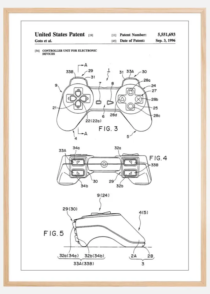 Denne patentplakat afbilder en spillekontrol fra Playstation, patentnummer 5,551,693, udstedt den 3. september 1996. Designet viser kontrolenhedens detaljerede layout og funktioner gennem forskellige synspunkter, hvilket ikke kun er en anerkendelse af dens funktionelle design, men også dens indflydelse i den voksende verden af elektroniske spil. Denne type spillekontrol er blevet en standard inden for spilindustrien og har haft en afgørende rolle i, hvordan vi oplever digitale spil.