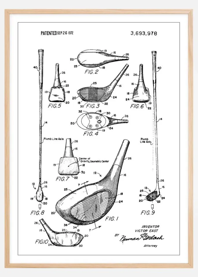 Denne patentplakat beskriver en elegant og teknisk detaljeret patenttegning af en golfkølle, patenteret den 26. september 1972 under nummer 3,693,978. De forskellige figurer, fra FIG. 1 til FIG. 10, viser køllens design fra flere perspektiver, hvilket fremhæver de gennemtænkte detaljer og balancen i konstruktionen. Denne illustration repræsenterer en unik blanding af teknik og sport og er en fascinerende visuel fortælling om designets evolution inden for golf.