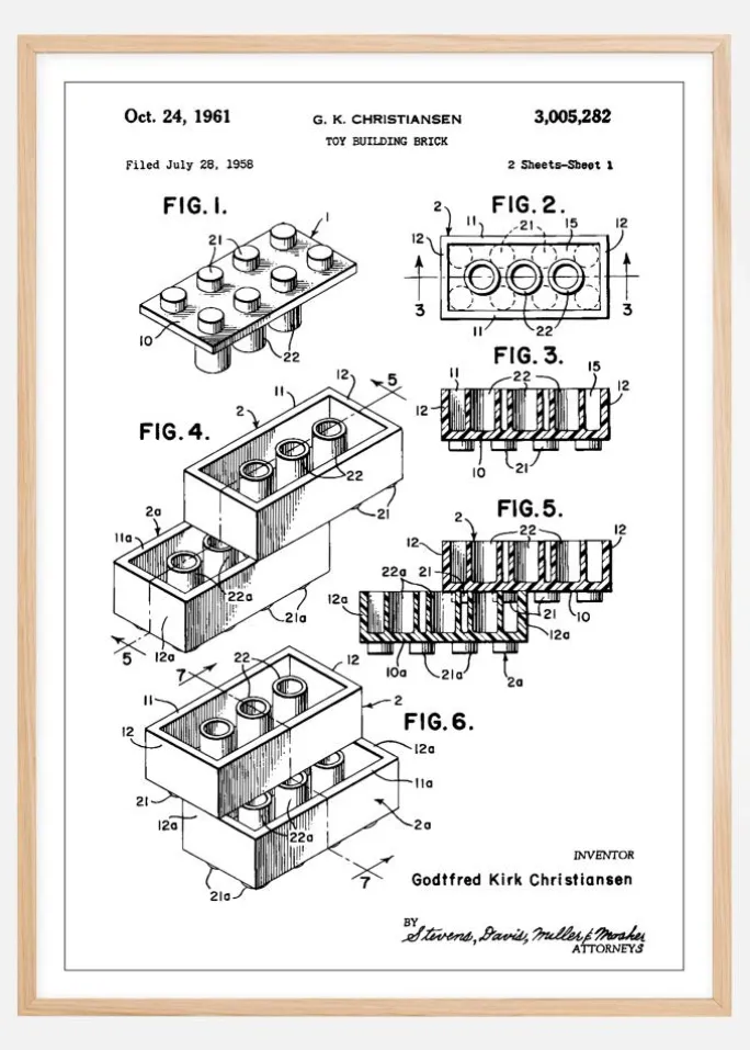 Denne plakat er en hyldest til det klassiske legetøjsbyggeklodspatent fra Lego, skabt af den visionære opfinder Godtfred Kirk Christiansen. Med patentnummer 3,005,282, som blev tildelt den 24. oktober 1961, repræsenterer dette design et betydeligt fremskridt inden for pædagogisk og kreativt legetøj. Illustrationen viser den tidlige version af byggeklodsen, som kom til at revolutionere leg og læring for børn over hele verden.
