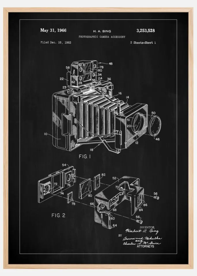 Denne sofistikerede patentplakat med en sort tavlebaggrund giver en stærk og stilren præsentation af et fotografisk kameratilbehør, patentnummer 3,253,528, udstedt den 31. maj 1966. Med sin skarpe, hvidlinjede illustration, der træder frem mod den mørke baggrund, tilbyder tegningen et detaljeret syn på en teknisk innovation, der har fremmet fotokunsten. Patentplakaten er en hyldest til den tid, hvor fotografiet begyndte at tage store skridt i teknologisk udvikling.