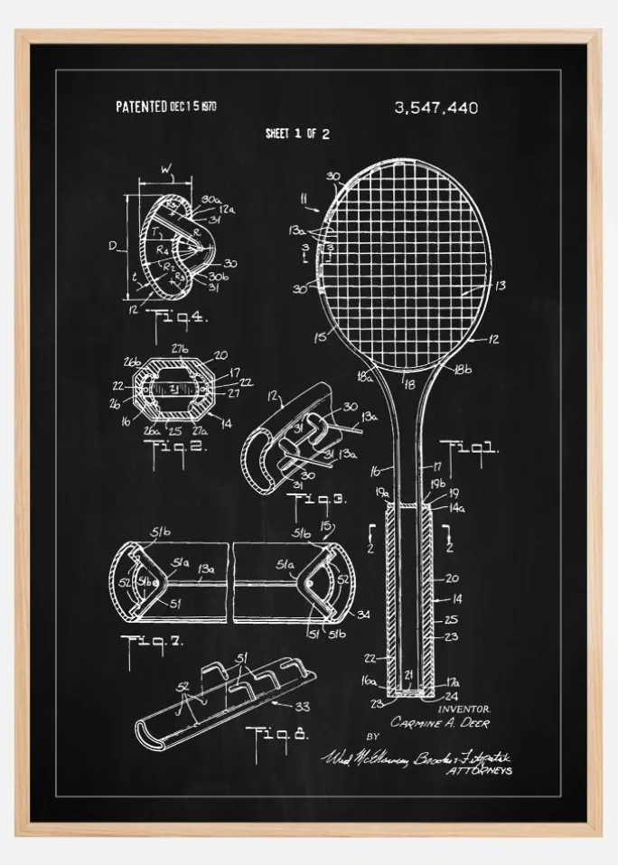 Denne patentplakat viser den tekniske illustration fra U.S. Patent 3,547,440, udstedt den 15. december 1970. Det er en intellektuel og æstetisk værdi, der tilfører en unik karakter til ethvert rum, ideel til tennisentusiaster og designelskere. Plakatens klassiske sort-hvide udseende fremhæver den detaljerede opbygning af en tennisracket og tilhørende komponenter, såsom grebet og strengene, samt forskellige perspektiver og sektioner af konstruktionen, der vises i de forskellige figurer.