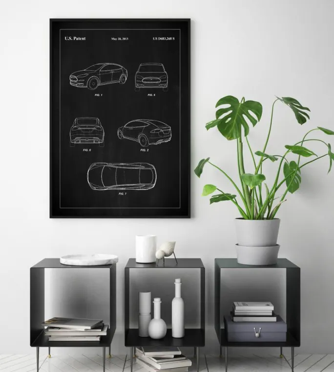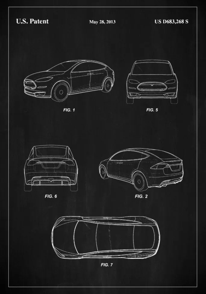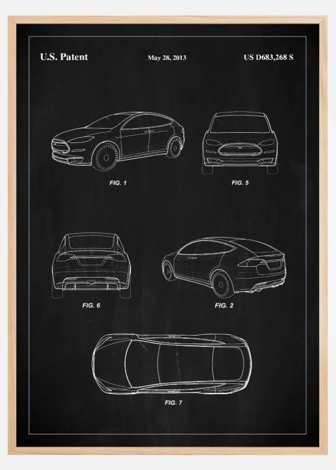 Denne elegante og sofistikerede patentplakat er en hyldest til moderne bilteknologi af en Tesla, som blev dokumenteret gennem det amerikanske patent med nummer US D683,268 S den 28. maj 2013. Plakaten viser en distinkt bilskulptur, der definerer bilproduktionens forkant. Hver linje og kurve er omhyggeligt tegnet i hvid på den sorte tavle, hvilket skaber en storslået kontrast, der fanger og holder betragtningens interesse.