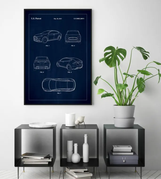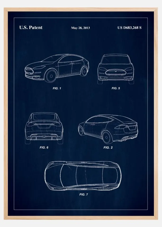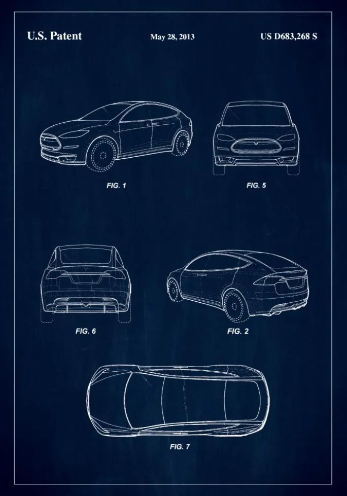 Vi er stolte af at præsentere denne patentplakat, en grafisk fremstilling af US D683,268 S, udstedt den 28. maj 2013, der skildrer et køretøjsdesign af en Tesla, der er lige så innovativt som det er æstetisk tiltalende. Plakaten er en ideel tilføjelse til ethvert samlerhjem eller arbejdsplads og tilbyder et unikt indblik i designprocessen bag en af de mest fremtrædende formgivninger inden for bilindustrien.