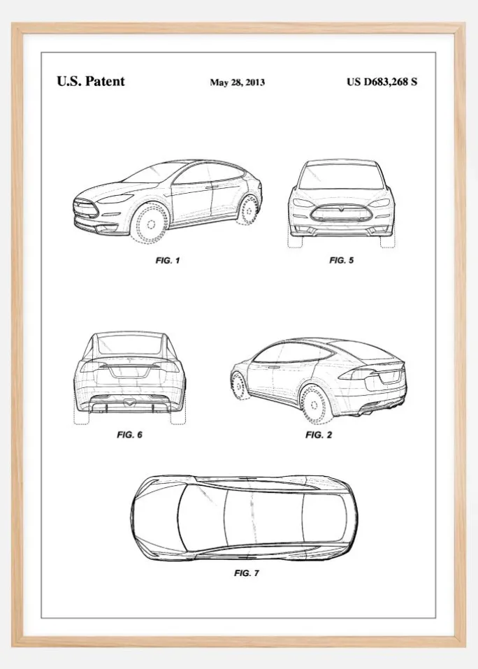 Opdag en verden af innovation og stil med denne distinkte patentplakat af en Tesla, som stolt præsenterer patentnummer US D683,268 S, bevilget den 28. maj 2013. Denne minimalistiske og stilrene patentplakat fremhæver et revolutionerende køretøjsdesign, der repræsenterer teknologiens forkant og industriel design. Plakaten fanger blikket med sine skarpe linjer og præcise detaljer, hvilket gør den til en fremtrædende indretningsdetalje i ethvert moderne hjem eller kontor.