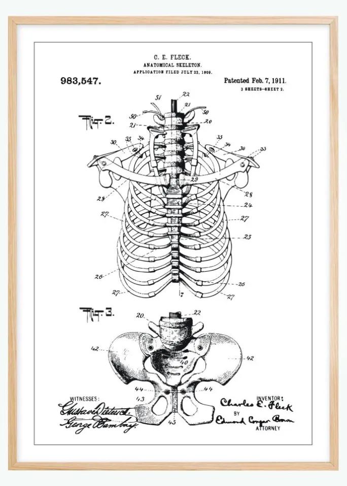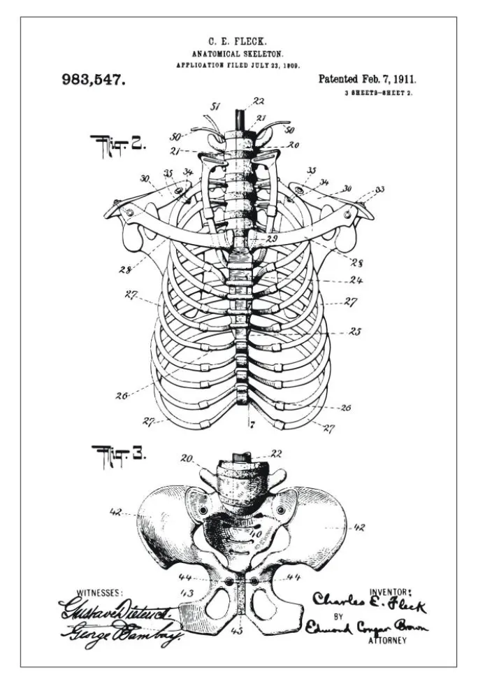 Denne patentplakat præsenterer en detaljeret illustration af en anatomisk skeletkonstruktion, patenteret af C.E. Fleck den 7. februar 1911, under patentnummer 983,547. Tegningen, som blev indsendt den 23. juli 1909, fremhæver skelettets opbygning og mekaniske forbindelser, specifikt hvordan ribbenene og rygsøjlen er konstrueret for at repræsentere den menneskelige anatomi nøjagtigt og pædagogisk.