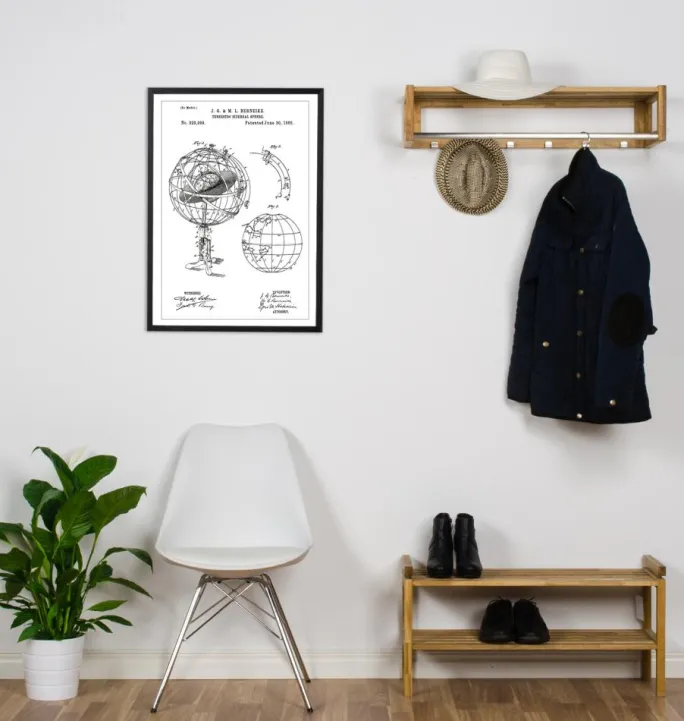 Udforsk himlens mysterier med denne stilfulde og intellektuelle patent plakat, der fremhæver J.G. & M.L. Berenikes opfindelse, “Terrestro Sidereal Sphere”, patenteret den 30. juni 1885, med patentnummer 320.999. Denne patenttegning viser en omhyggeligt konstrueret astronomisk apparat, der blev brugt til at modellere stjernernes og planeterne bevægelser i forhold til jorden, hvilket gjorde den til et vigtigt værktøj for datidens astronomer og opfindere.