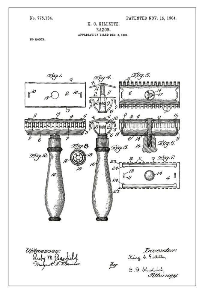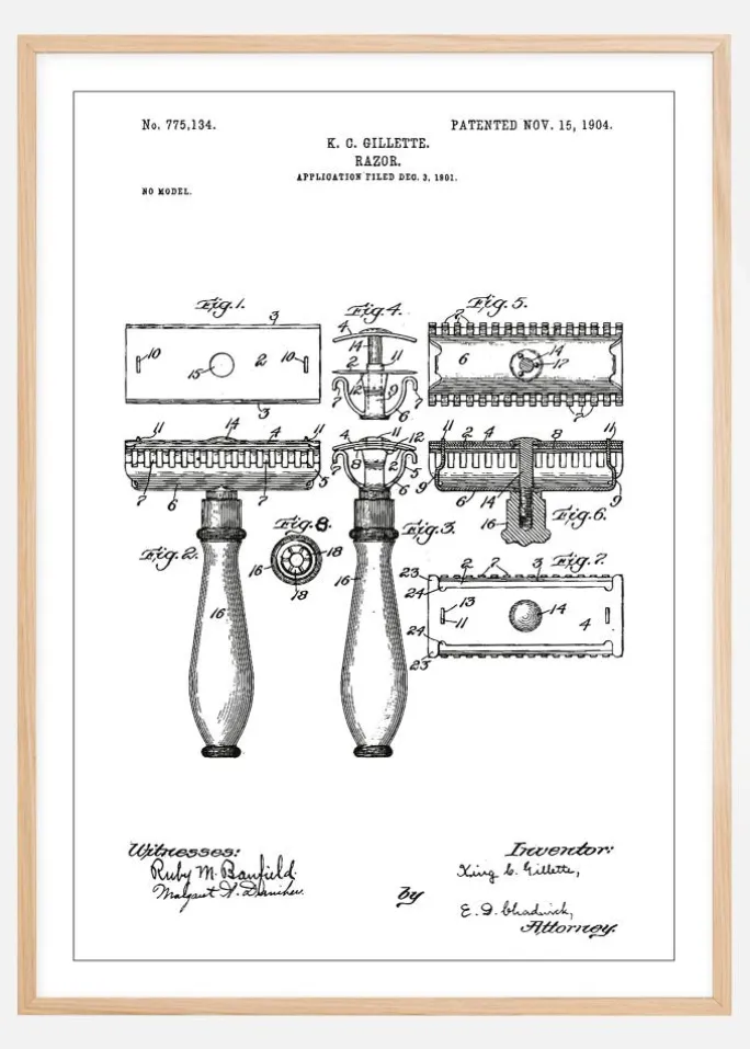 Med et ikonisk og stilrent design præsenterer denne patentplakat K.G. Gillettes banebrydende skabelse: skraberen, patenteret den 15. november 1904, patentnummer 775.134. Detaljerne i denne patenttegning fremhæver de mekaniske aspekter og den banebrydende konstruktion, der ændrede personlig hygiejne for altid, og dette blev dokumenteret for første gang i december 1901.