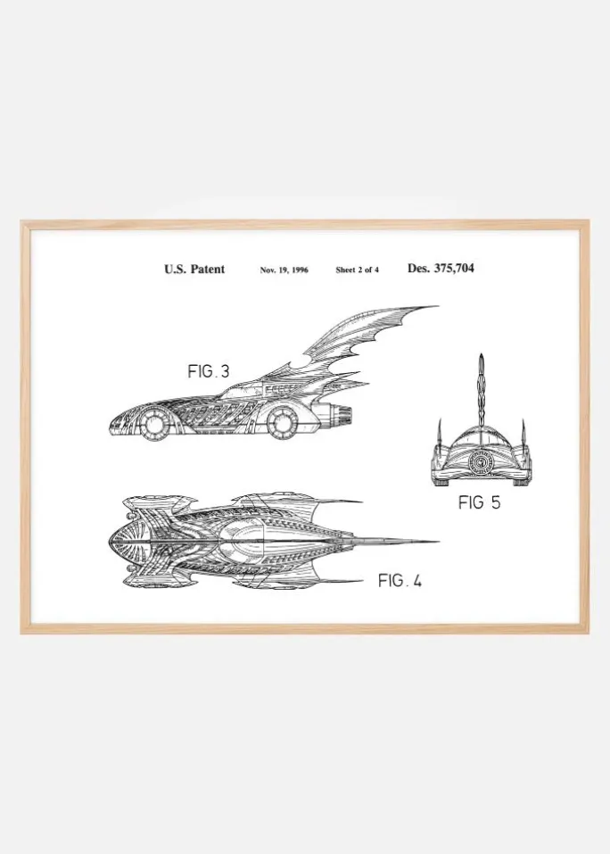 Denne unikke patentplakat viser storslåede skitser fra det amerikanske patent Des. 375,704, dateret den 19. november 1996. Denne kunstneriske patenttegning giver en kreativ atmosfære til ethvert rum med afbildninger af et konceptkøretøj, der er lige så meget et kunstværk som en teknisk bedrift. FIG. 3 og FIG. 4 viser en Batmobile i profil og oversigt, hvilket giver betragteren en følelse af dens innovative form og struktur, mens FIG. 5 fokuserer på den karakteristiske bagenden og dens unikke egenskaber.