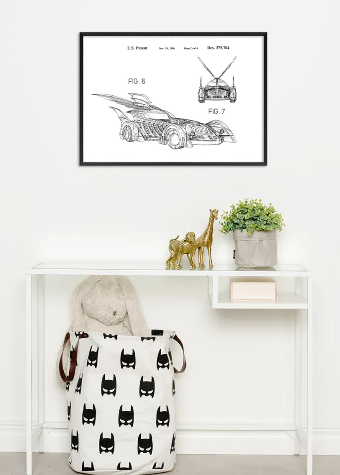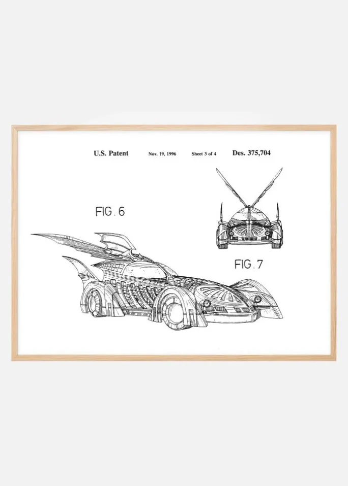 Med et dristigt og fantasifuldt motiv tilbyder denne patentplakat et eksklusivt indblik i designprocessen bag et ekstraordinært køretøj. Dokumenteret i det amerikanske patent Des. 375,704, udstedt den 19. november 1996, viser FIG. 6 og FIG. 7 to forskellige perspektiver af en Batmobile, som udmærker sig med sin aerodynamiske silhuet og dramatiske styling. Detaljerne i denne patenttegning, fra de svungne linjer til de store, udsmykkede vinger, gør den til en uimodståelig indretningsdetalje for samlere og designentusiaster.