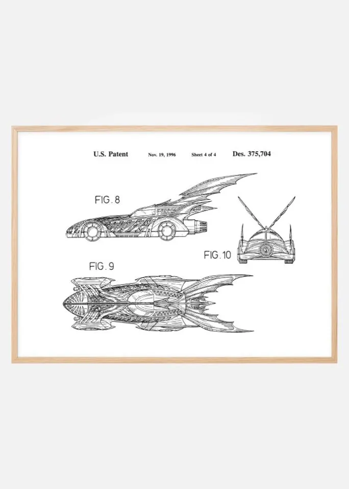 Denne patentposter fanger essensen af futuristisk design og opfindsomhed. Den er en del af det amerikanske patent Des. 375,704, udstedt den 19. november 1996. Med tre forskellige visninger af Batmans bil, er denne patenttegning et udtryk for fremtidens visioner, som designeren så for sig. Hver figur afslører detaljerede og gennemtænkte dele af køretøjets konstruktion, fra de strømlinede sidepaneler til de ikoniske vinger, der strækker sig ud fra bagsiden, hvilket gør det til en ikonisk indretningsdetalje for alle, der værdsætter design og innovation.