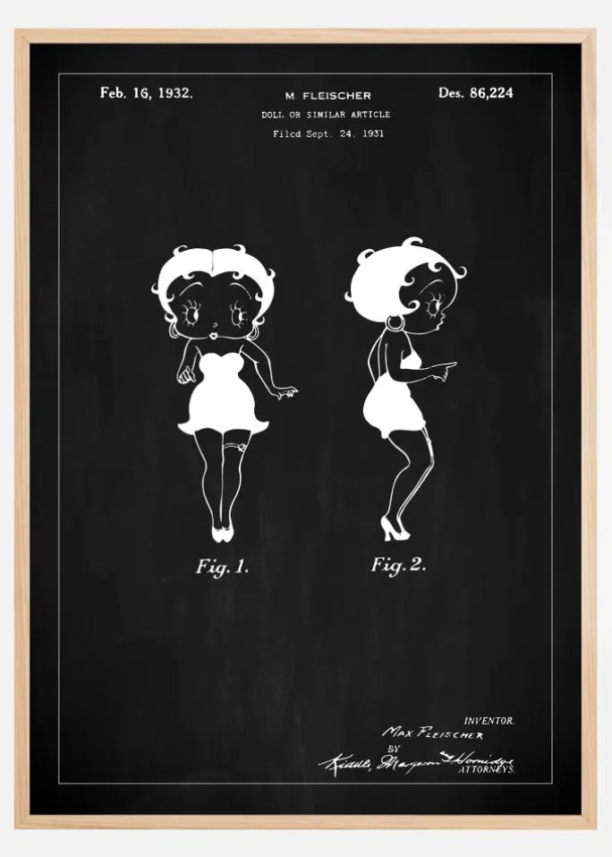 Denne charmerende patentplakat repræsenterer en dukke, der forestiller Betty Boop, designet af M. Fleischer, og blev tildelt et designpatent den 16. februar 1932 under patentnummer Des. 86.224. Patentanmodningen blev indgivet den 24. september 1931 og viser to figurer af dukken, en forfra og en fra siden, hvilket giver en komplet forståelse af dukkens design og karakter. Dette patentdokument indfanger den distinkte stil og personlighed, der var populær på den tid.