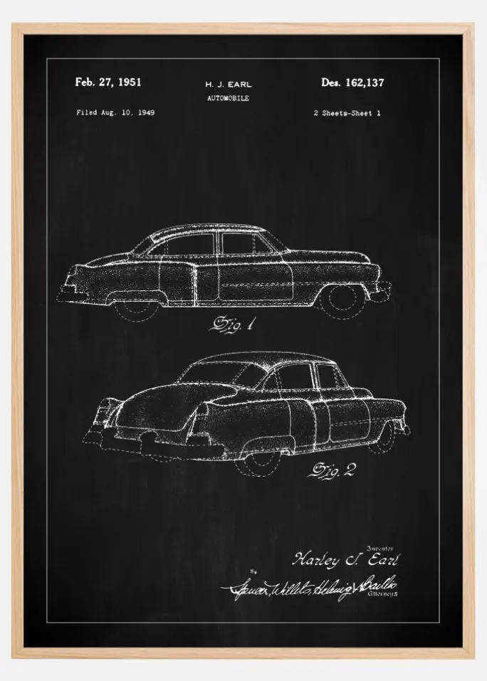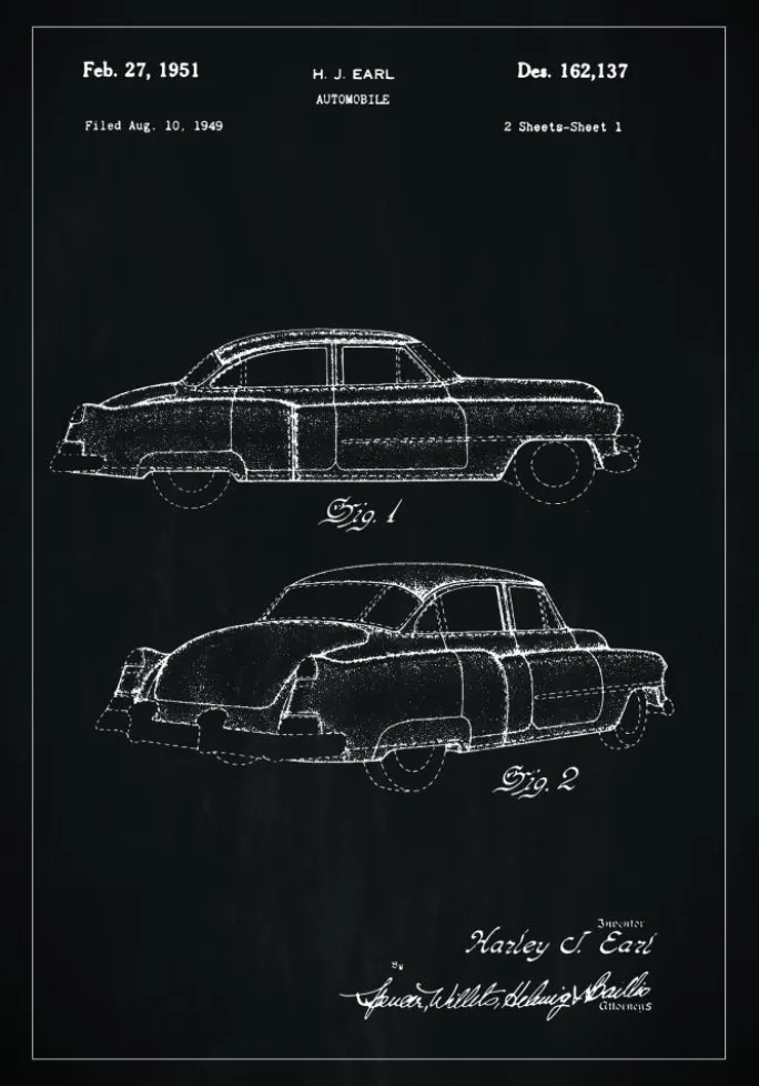 Denne patentplakat præsenterer et elegant billede af en Cadillac, patenteret den 27. februar 1951 af H.J. Earl under patentnummeret Des. 162,137. Detaljerne i denne tegning, indsendt den 10. august 1949, fanger den dynamiske form og det innovative design, som blev kendetegnende for den æra af bilindustrien. Sidevisningen og den tredimensionelle vinkel giver et unikt indblik i bilens proportioner og karosseridesign, hvilket fremhæver den stil og skønhed, der var fremtrædende i 1950’erne.