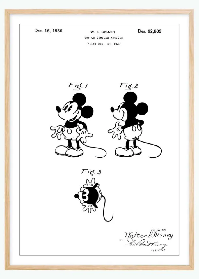 Denne patentplakat fremhæver en Mickey Mouse, designet af W.E. Disney og godkendt den 16. december 1930, under patentnummer Des. 82.802. De tre illustrationer præsenterer forskellige synsvinkler af figuren, som viser designets ikoniske egenskaber og charme. Dette motiv er et vigtigt dokument fra en tid, hvor legetøjsdesign begyndte at få en større rolle i populærkultur og massemedier.