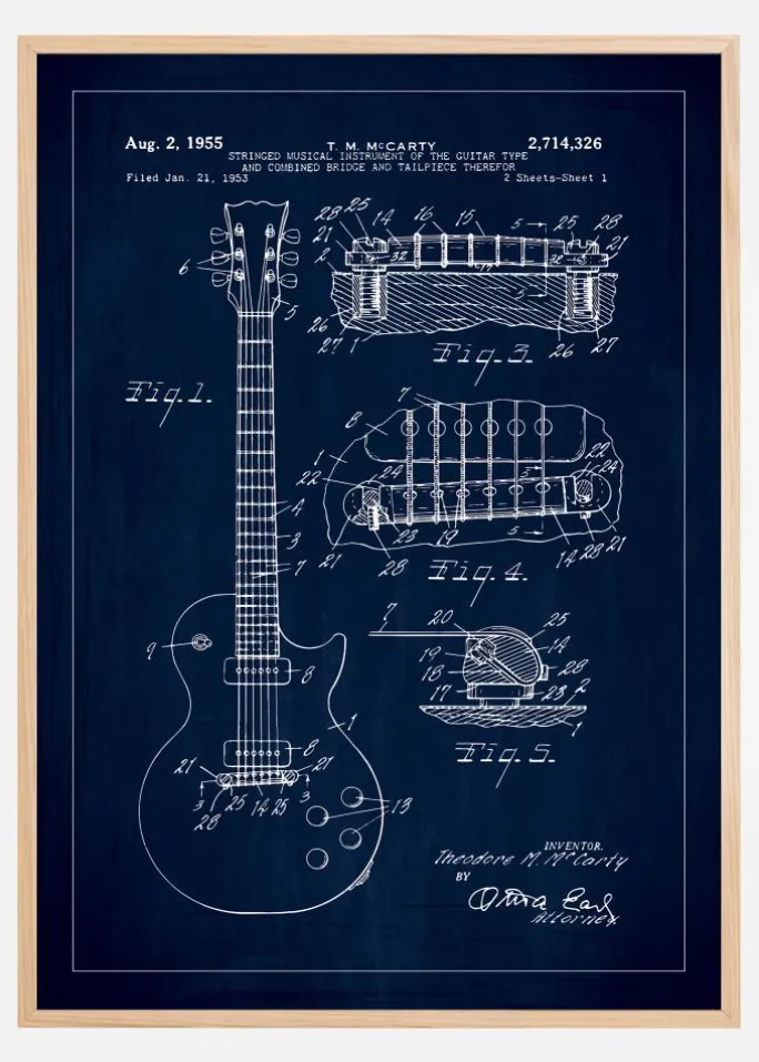 Denne patentplakat viser en detaljeret og nøjagtig tegning af et strengeinstrument fra den 2. august 1955, med patentnummer 2,714,326. Patentet for dette instrument, som af mange ville blive genkendt som en elguitar, blev registreret af Theodore M. McCarty den 21. januar 1953. Plakaten skildrer instrumentet i et elegant helhedsbillede samt i teknisk avancerede detaljevisninger, hvilket fremhæver det innovative design og den kombinerede bro og stol som en del af dets unikke egenskaber.