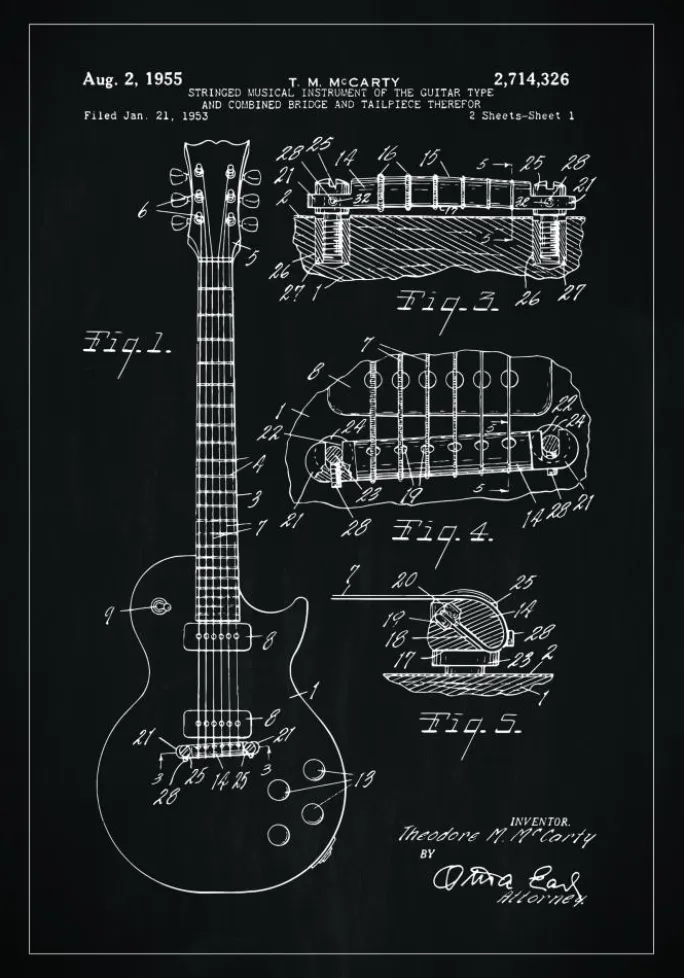 Denne patentplakat afbilder et klassisk strengmusikinstrumentdesign, især en elguitar, med datoen 2. august 1955 og patentnummer 2.714.326. Patentet blev indgivet den 21. januar 1953 af Theodore M. McCarty, og det præsenterer guitarens elegante form og opfindsomme mekanik. Illustrationen, med dens detaljerede udsigt over instrumentets front, sektionssnit og komponentdetaljer, viser den tidløse skønhed og håndværk bag dette musikinstrument.